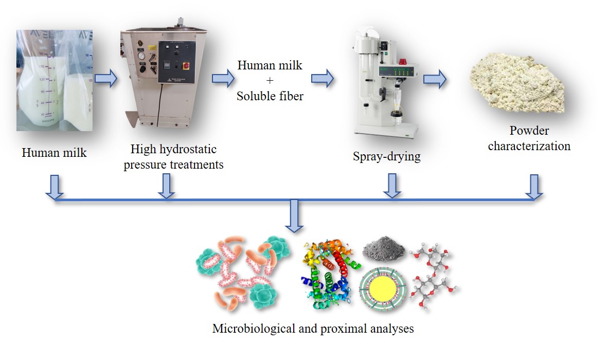Los bancos de leche humana (BLH) utilizan la pasteurización y congelación, como principales métodos de conservación para la leche humana (LH). Sin embargo, su valor nutricional disminuye durante la descongelación y almacenamiento. El objetivo del presente estudio fue evaluar el efecto de las altas presiones hidrostáticas (APH) y el secado por aspersión sobre los macronutrientes, la calidad microbiológica e inactivación de Staphylococcus aureus en LH. Para ello, se realizó la cuantificación de proteínas, lípidos, carbohidratos, cenizas, bacterias lácticas, mesófilos aerobios, coliformes, mohos, levaduras y S. aureus. Los resultados mostraron que S. aureus y los grupos microbianos evaluados fueron reducidos por debajo del límite permitido por los BLH (<10 UFC/mL). Mientras que las concentraciones de macronutrientes permanecieron sin cambio durante todo el proceso de conservación. El uso de fibra soluble durante el proceso de secado permitió obtener un rendimiento mayor al 99 %. El polvo mostró alta solubilidad y bajos niveles de humedad y actividad en agua; las cuales son propiedades deseables en los alimentos deshidratados. Por lo tanto, la combinación de HHP y el proceso de secado por aspersión demostró ser una alternativa que facilitar el manejo, mejora la calidad microbiana y permite la adición de oligosacáridos manteniendo el valor nutricional de la LH.