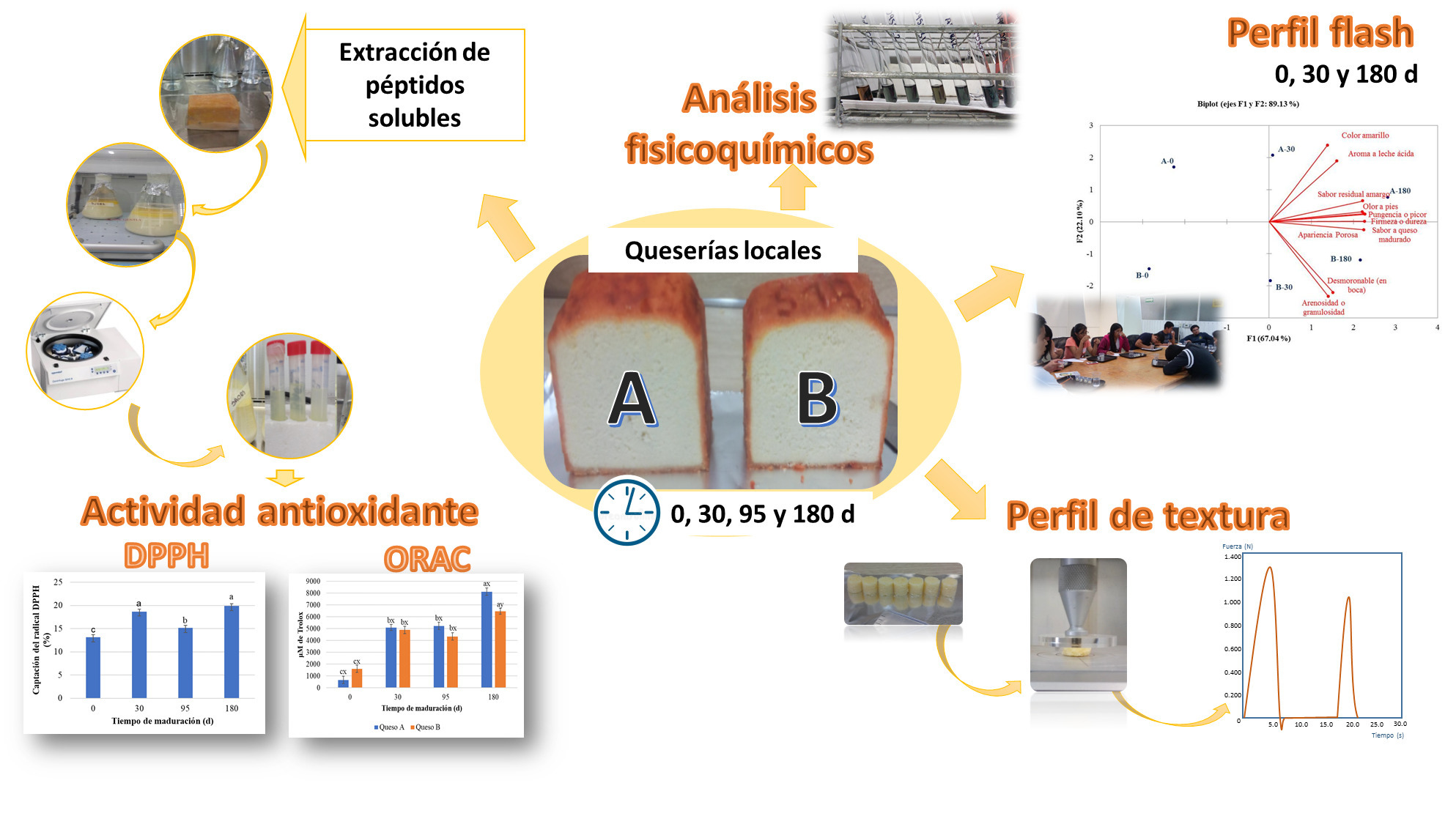 La proteólisis durante la maduración de los quesos contribuye a la generación de biopéptidos, y a cambios en las características sensoriales y texturales. El objetivo de este trabajo fue determinar la capacidad antioxidante, así como los cambios en las características sensoriales y texturales del queso añejo de Zacazonapan, durante la maduración (0, 30, 95 y 180 d). A los 95 días los extractos de los quesos evaluados presentaron el mayor contenido de proteína soluble. El grado de hidrólisis de proteínas obtenido a los 95 y 180 días de maduración fue 7.43 ± 0.34 y 6.44 ± 0.31 %, respectivamente. La captación del radical libre DPPH fue mayor a los 30 y 180 días (18.70 ± 0.48 y 19.92 ± 0.48 %, respectivamente), mientras que la mayor capacidad de absorción de radicales de oxígeno (ORAC) se registró a los 180 días. Con respecto a las características sensoriales, los quesos con 180 días presentaron atributos como sabor residual amargo, olor a pies, dureza, pungencia, sabor a queso madurado y apariencia porosa; además de una textura dura y baja elasticidad.