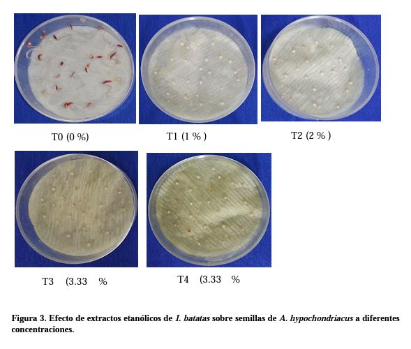 extractos acuosos y etanólicos de Ipomoea batatas a diferentes concentraciones (0, 1, 2 y 3.33 %) sobre plantas aceptoras: Amaranthus hypochondriacus y Portulaca olecarea en condiciones controladas, tomando como variables respuesta; la germinación total (GT), índice de velocidad de germinación