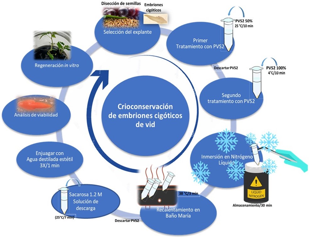 La vid es uno de los principales cultivos del mundo y el estado de Sonora es el mayor productor de México. Este cultivo está en constante peligro por diversos factores bióticos y abióticos, de ahí la importancia de su conservación. La crioconservación es idónea para este cultivo, pero puede provocar alteraciones fisiológicas, moleculares y bioquímicas, afectando la viabilidad y la regeneración. Por lo anterior, en este trabajo se planteó analizar el efecto de las etapas del protocolo de crioconservación sobre la viabilidad y regeneración de embriones cigóticos de vid. La viabilidad del tejido (V) y la regeneración de plántulas (RP), mostraron que la PVS2 ejerce protección a los embriones (V:85%, RP:60%), mientras que la exposición combinada a la solución PVS2 y nitrógeno líquido (NL) ocasionó diminución de la viabilidad y regeneración (V:68%; RP: 2%). Un efecto más drástico se observó cuando el tejido fue expuesto a PVS2+NL y recalentamiento (RC) (V:68%; RP:0%). Sin embargo, la viabilidad y la regeneración se recuperó cuando el tejido se sometió a PVS2+NL+RC y solución de descarga (SD) (V:92%; RP:60%). Se concluye que la utilización de la solución de descarga es fundamental para evitar daños a los tejidos debido a las diferentes etapas de crioconservación.