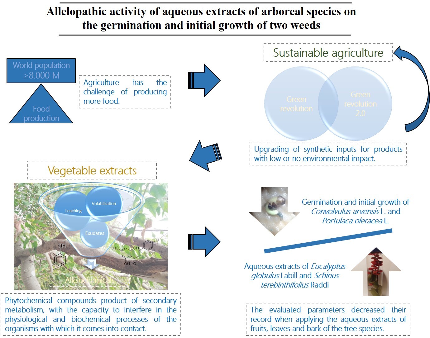 En la búsqueda de opciones sostenibles de manejo de las arvenses Convolvulus arvensis L. y Portulaca oleracea L., se evaluó in vitro el potencial de inhibición de germinación y crecimiento inicial del extracto acuoso de fruto, hoja y corteza de las especies arbóreas, con características alelopáticas, Eucalyptus globulus Labill. y Schinus terebinthifolius Raddi. La inhibición de germinación y crecimiento se evaluó al exponer semillas de las arvenses, dispuestas dentro de una caja Petri, a la aspersión del extracto a diferentes concentraciones. Los extractos de fruto y hoja de S. terebinthifolius, así como el de hoja de E. globulus, inhibieron la germinación y crecimiento de ambas malezas a partir del formulado al 2.5 %. La actividad biológica de los extractos se relacionó positivamente con la concentración. Los resultados sugieren que los extractos de las arbóreas representan una herramienta útil en el manejo agroecológico de las dos arvenses.