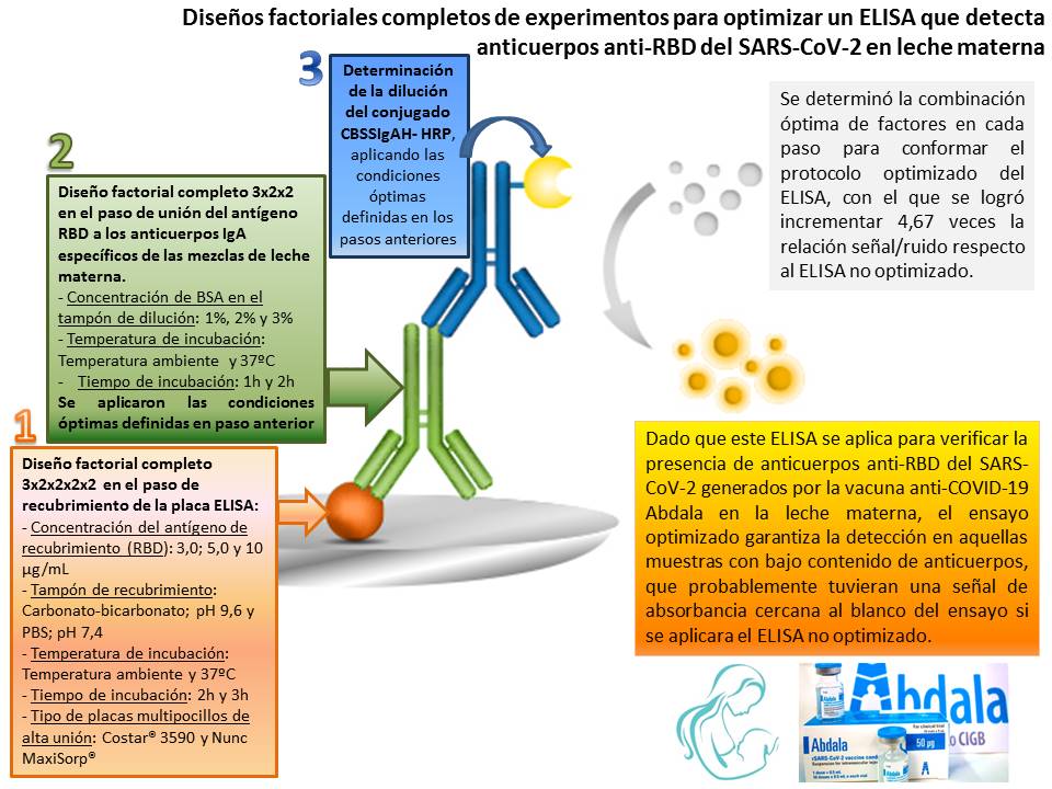 El diseño factorial completo de experimentos se ha utilizado con poca frecuencia para optimizar inmunoensayos, a pesar de sus ventajas en el ahorro de tiempo y recursos y sus resultados confiables. El objetivo de este trabajo fue optimizar un ELISA, que detecta anticuerpos IgA anti-RBD del SARS-CoV-2, mediante la aplicación de experimentos factoriales completos en varias etapas del ensayo. Se evaluaron las interacciones entre todos los factores y niveles en cada etapa, usando mezclas de leche materna, con alto y bajo contenido de anticuerpos, colectadas de puérperas vacunadas con la vacuna anti-COVID-19 Abdala. Se determinó la combinación óptima de factores y niveles para conformar el protocolo optimizado del ELISA, con el que se logró incrementar 4,67 veces la relación señal/ruido del ensayo respecto al protocolo no optimizado. Dado que este ELISA se aplica para verificar la presencia de anticuerpos anti-RBD del SARS-CoV-2 generados por la vacuna Abdala en la leche materna, el ensayo optimizado garantiza la detección en aquellas muestras con bajo contenido de anticuerpos, que probablemente tuvieran una señal de absorbancia cercana al blanco del ensayo si se aplicara el protocolo inicial no optimizado.
