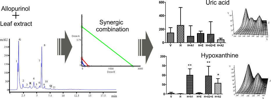 Hay una necesidad de nuevas alternativas al uso medicinal de alopurinol. En este sentido, el presente estudio obtuvo un extracto de hojas de L. leucocephala al cual se le determinó su composición química, acción inhibitoria contra xantina oxidasa (XO) in vitro, interacción inhibitoria entre el extracto y alopurinol, y acción inhibitoria contra XO in vivo empleando ratones bajo administración de hipoxantina y oxonato de potasio. Compuestos polifenoles y flavonoides fueron detectados y cuantificados en el extracto de hojas. Para el extracto solo, su valor IC50 y máximo de inhibición contra XO fueron de 334.60 µg/mL y 46.4 %. La combinación a una proporción 3:1 de alopurinol y extracto obtuvo valores IC50 y waDRI de 1.35 µg/mL, 1.13 (alopurinol) y 1015.72 (extracto) para inhibir a XO, resultando en una interacción sinérgica contra XO in vitro. Donde esta misma combinación incrementó el éxito terapéutico en el modelo murino al compararse con la administración de alopurinol solo. Nuestro estudio presenta la primera evidencia para el uso de una combinación de alopurinol y extracto de L. leucocephala a una proporción 3:1 como un sustituto para la administración de alopurinol solo.