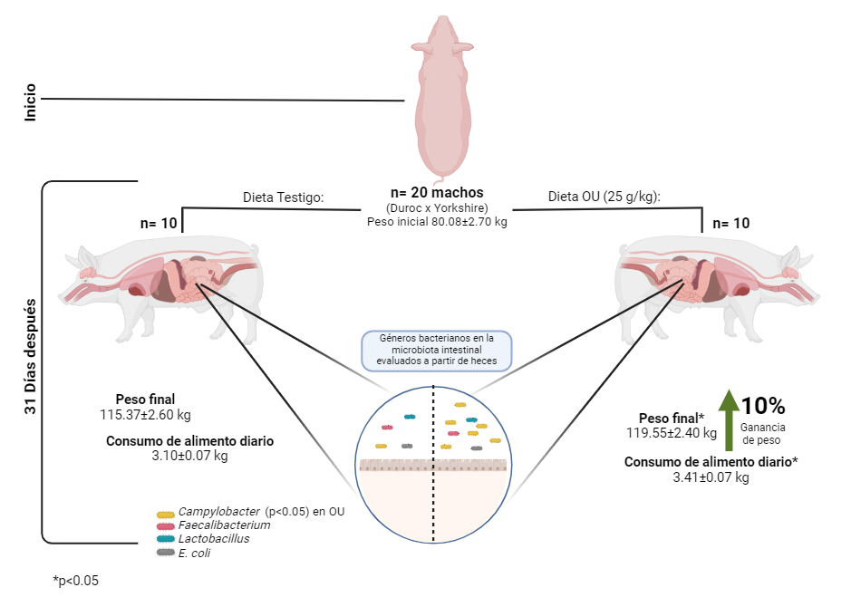 El objetivo del trabajo fue evaluar el efecto de la suplementación de orujo de uva (OU) sobre la microbiota intestinal (MI) y desempeño productivo de cerdos finalizadores. Se utilizaron 20 cerdos finalizadores machos (Duroc x Yorkshire, peso vivo inicial de 80 kg), alojados individualmente en corraletas provistas de bebedero y comedero. Se asignaron aleatoriamente a uno de dos tratamientos (n = 10): Testigo (dieta comercial, (DB) sin OU) y OU (DB + 25 g OU/ kg). La prueba de alimentación fue de 31 d. El comportamiento productivo se evaluó mediante la ganancia de peso diaria, el consumo de alimento diario y la conversión del alimento. Los cambios en la composición y abundancia en MI se evaluaron mediante qPCR en muestras de heces. La suplementación con OU incrementó significativamente (p < 0.05) el consumo de alimento y la ganancia de peso, pero no mostró efecto en la conversión alimenticia (p > 0.05). En la MI, la suplementación con OU no tuvo efecto (p > 0.05) en la abundancia de los géneros Lactobacillus spp, Faecalibacterium praustnitzi y E. coli, pero Campylobacter spp. incrementó (p < 0.05). Si bien, no se observó el comportamiento esperado en MI, su efecto positivo en la ganancia de peso podría permitir acortar los tiempos de producción.