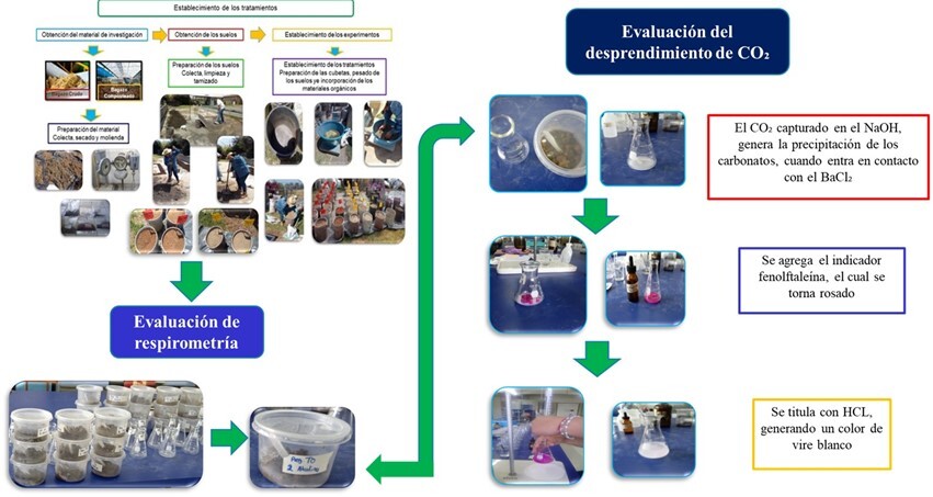 El estudio de respiración del suelo (emisión microbiana de CO2) por incorporación de residuos orgánicos (RO) provenientes de la agroindustria (bagazo y composta de bagazo), permite estimar el efecto ambiental en relación a la emisión de CO2 por la mineralización del carbono durante su proceso de descomposición, lo cual debe ser considerado desde el punto de vista de cambio climático. Por lo anterior, el objetivo fue evaluar la dinámica de emisión de CO2 por la mineralización de cuatro materiales lignocelulósicos, incorporados en suelos de diferente textura. Mediante la técnica de respiración alcalina, se cuantificó la respiración de CO2 en Regosol y Luvisol por incorporación de dos bagazos (TBD y TBA) y sus compostas (TCD y TCA) durante 30 días bajo condiciones controladas de humedad y temperatura. Los tratamientos TBD y TBA, incrementaron la actividad microbiológica con mayores emisiones; mientras que los tratamientos TCD y TCA, incrementaron el contenido de C orgánico suelo (COS) con menores emisiones. La emisión de CO2 se relacionó con la mineralización de los RO y ésta a su vez con su composición química y su resistencia a la descomposición, además la dinámica de las emisiones fue diferente por tipo de material y por tipo de suelo. La incorporación de RO de tipo bagazos, es una opción para incrementar la actividad microbiana edáfica, pero con mayor emisiones de gases de efecto invernadero (GEI); mientras que los RO de compostas generan un incremento en la captura de COS y, por ende, mayor almacén de C y una menor emisión de CO2.
