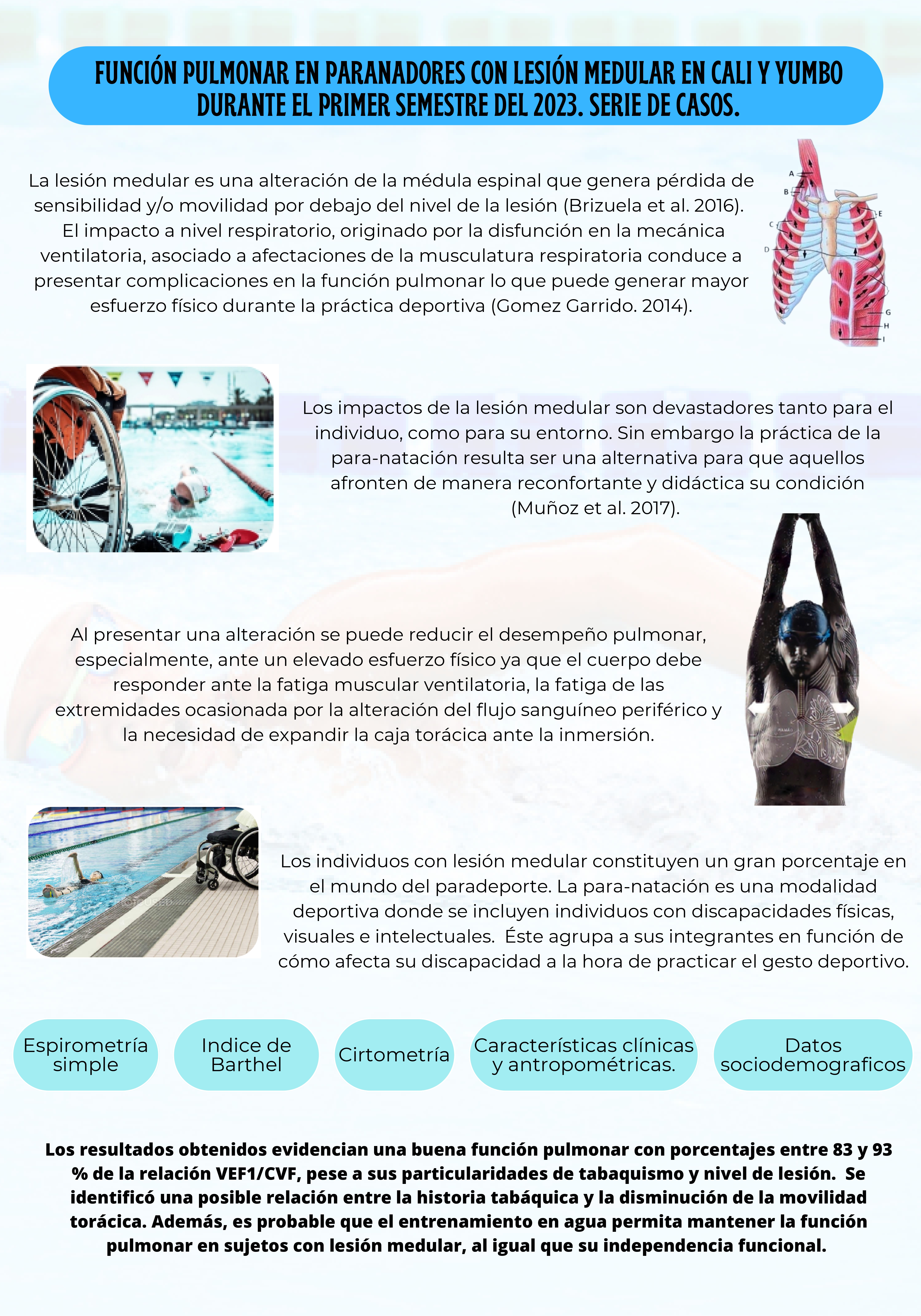 El objetivo del presente trabajo fue describir algunas características de la función pulmonar de cuatro paranadores con lesión medular de Cali-Colombia. Se incluyeron cuatro deportistas de iniciación deportiva de para-natación con lesión medular de cualquier nivel neurológico, quienes firmaron el consentimiento informado. Se tomaron datos sociodemográficos, clínicos, deportivos, antropométricos, independencia funcional y función pulmonar mediante espirometría y movilidad torácica mediante la cirtometría. Los resultados evidencian cuatro paranadores entre 26 y 42 años, con niveles neurológicos entre T2-T4 y T10-T11. Ninguno de los casos presentó enfermedades respiratorias pre y post lesión, dos de los casos presentaron historial tabáquico. Los casos llevaban entre tres y doce meses practicando el deporte, todos con normopeso según IMC; con dependencia leve según Índice de Barthel. Además, presentaron valores entre 83 % y 93 % del valor predicho en la relación VEF1/CVF. La mejor toma de la movilidad torácica a nivel axilar estuvo entre 1,5 y 5,6 cm y a nivel xifoideo entre 1,5 y 2,5 cm. Se concluye que los sujetos no tuvieron alteraciones en la función pulmonar, que los deportistas con historial tabáquico y nivel de lesión más alto presentaron disminución en la movilidad torácica, el entrenamiento en agua puede otorgar beneficios a nivel pulmonar.
