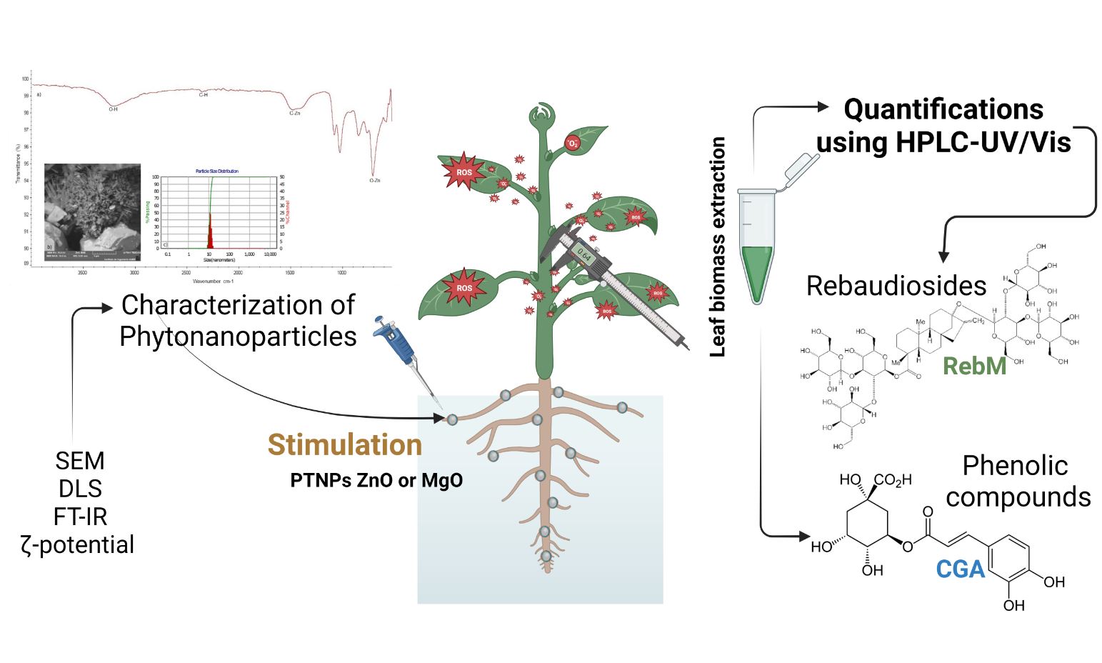La demanda de edulcorantes naturales ha ido en aumento; Esta tendencia está influenciada por varios factores, incluidas las preocupaciones y controversias en torno a los edulcorantes sintéticos. Este estudio tiene como objetivo determinar el efecto de la provocación con fitonanopartículas de ZnO y MgO (PTNP) en plantas de Stevia rebaudiana. La síntesis de PTNP utilizó el potencial de reducción del extracto acuoso natural derivado de las hojas de Moringa oleifera. La caracterización de los PTNP se realizó mediante métodos espectroscópicos. Las imágenes de microscopio electrónico de barrido de las PTNP de ZnO mostraron la presencia de nanopartículas aglomeradas en forma de varilla, mientras que las PTNP de MgO tenían forma irregular y estaban aglomeradas. El análisis de dispersión dinámica de la luz mostró un tamaño promedio de 9 a 30 nm para los PTNP de ZnO y de 5 a 10 nm para los PTNP de MgO, mientras que los valores del potencial zeta (ζ) validaron la estabilidad de los PTNP. Los espectros infrarrojos revelaron bandas correspondientes a vibraciones de estiramiento de los enlaces de los grupos implicados en la reducción y estabilización de los PTNP. La mayor producción de rebaudiósidos A, E y M se obtuvo utilizando 1 mg/L de ZnO PTNP. La elicitación con PTNPs principalmente con ZnO a partir de la concentración de 20 mg/L induce la producción de moléculas con capacidad antioxidante, obteniendo un aumento del 137% del ácido clorogénico, mientras que el del ácido cafeico es del 185%. Estos resultados indicaron que la aplicación de PTNP de ZnO y MgO indujo un mayor contenido de compuestos antioxidantes en Stevia rebaudiana.