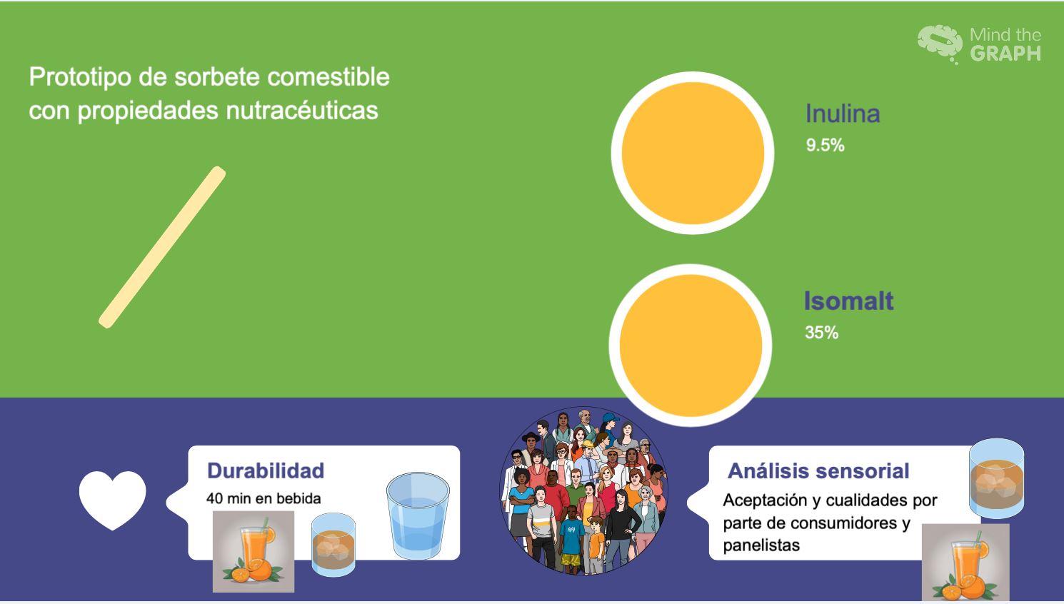 En un entorno natural, los sorbetes de plástico de un solo uso o desechables se desintegran en 500 años, mientras que los sorbetes comestibles, elaborados con ingredientes naturales, se disuelven en 40 minutos al entrar en contacto directo con la bebida. El propósito de este estudio fue desarrollar un prototipo de sorbete comestible con ingredientes de interés nutracéutico para el consumo de bebidas. Se diseñó un estudio experimental para determinar la dosis de inulina e isomalt conforme a las normas permitidas para el consumo humano, además, se llevo a cabo un análisis sensorial mediante una prueba de aceptación con escala hedónica de 7 puntos y un grupo focal para evaluar las cualidades del sorbete comestible. Los contenidos de inulina e isomalt en el sorbete fueron del 9.5 % y 30 %, respectivamente. Las calorías fueron de 379.98 kcal/100 g, con una diferencia de 14,83 kcal/100 g respecto a una fórmula con edulcorante 100% calórico. Se evaluó la durabilidad a distintos niveles de pH en bebidas (ácido, neutro y alcalino). Tras 40 minutos de contacto directo con la bebida, no hubo diferencias entre los tres tratamientos. La aceptación del sorbete comestible por los panelistas/consumidores se vio reflejada por el tipo de bebida que se va a consumir (jugo de naranja y té frío comercial).